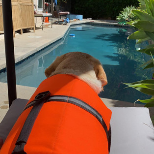 OMG the heat here now is amazing. You get a hiatus until 11am (June gloom it is known as, Im told), as there is a haze which makes it warm but cool. Then the clouds go and it’s incredibly hot- up to 38 degrees minimum. Lulu keeps getting in and out of her paddling pool and she loves swimming with me in the main pool. She actually swims lengths along side me with her bright orange life jacket on.